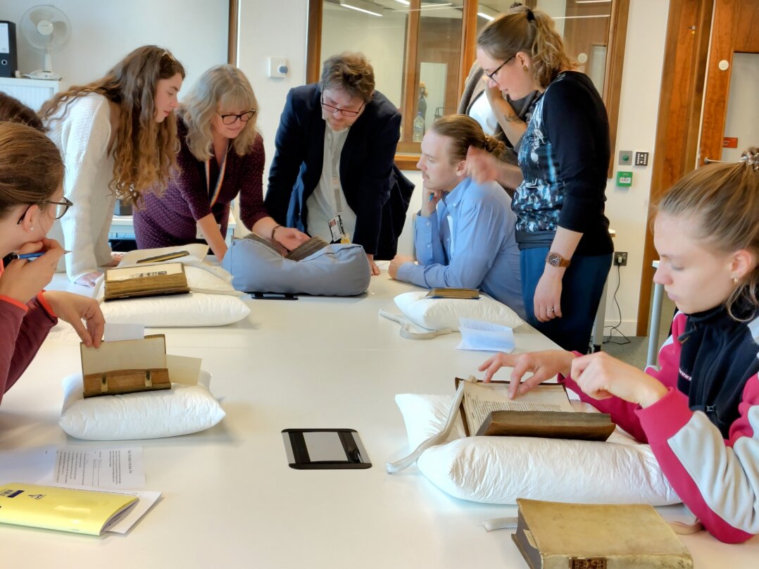 Zunächst verbrachten wir zwei Tage in Canterbury. Dort arbeiteten die 20 Teilnehmer*innen der Studienreise in den Special Collections & Archives der Templeman Library an der University of Kent. Unterstützung bekamen sie durch Dr. Suzanna Ivanic, Dr. Ryan Perry und Dr. Robert Gallagher des Centre for Medieval and Early Modern Studies sowie die Bibliothekarin Christine Davie und zwei Doktorandinnen. Für die meisten unserer Studierenden war es das erste Mal, dass sie mit Originalexemplaren arbeiteten. Im Anschluss fand ein Workshop statt, bei dem die Studierenden ihre Erfahrungen und Ergebnisse des Vormittags mündlich vorstellten und in einen anregenden Fachdialog mit den Dozierenden und Expert*innen vor Ort traten. Den krönenden Abschluss bildete die Führung durch die Kathedrale von Canterbury, UNESCO-Welterbestätte und das älteste Gotteshaus seiner Art in England.